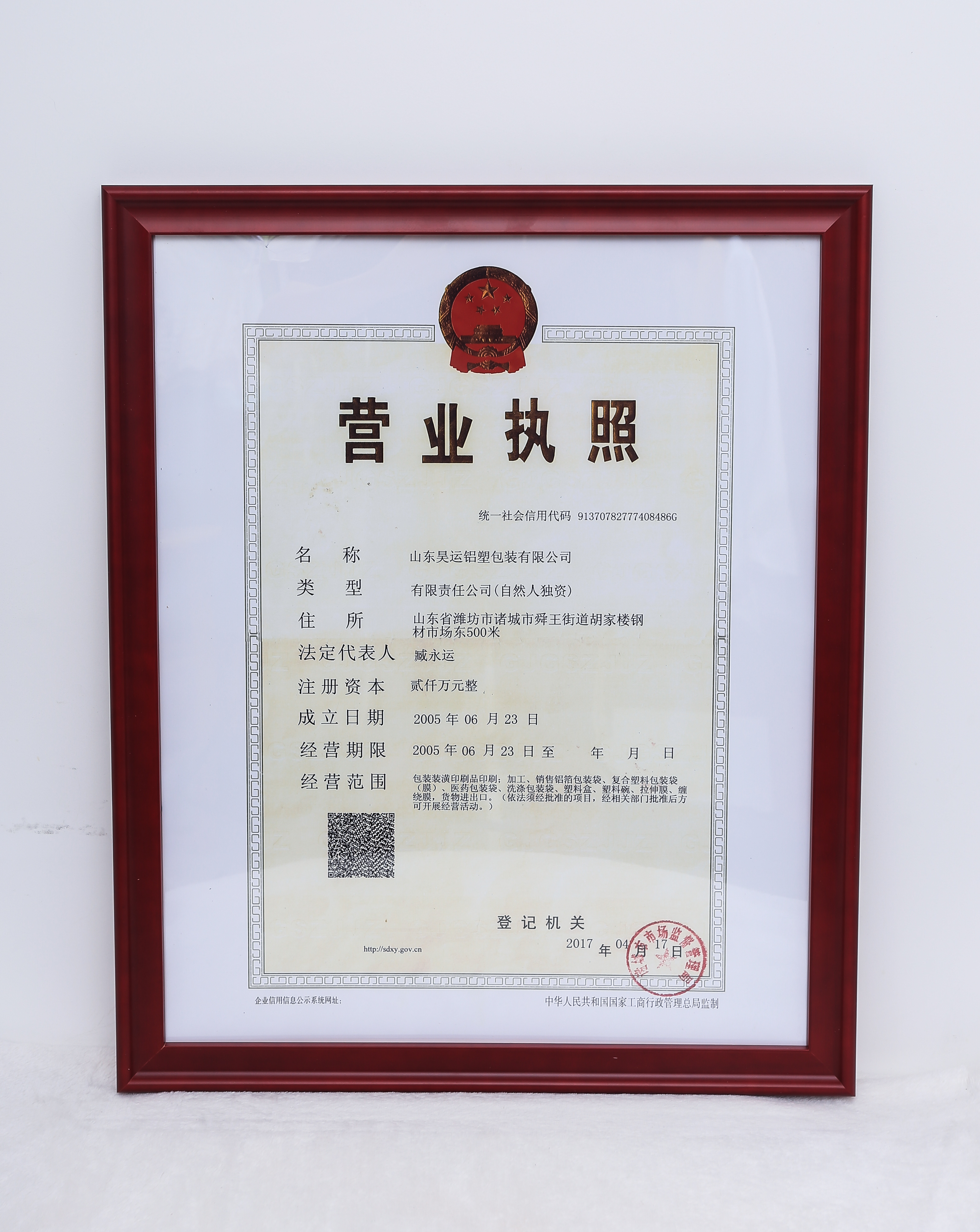 包装装潢印刷品印刷;加工、销售铝箔包装袋、复合塑料包装袋(膜)、医药包装袋、洗涤包装袋、塑料盒、塑料碗、拉伸膜、缠绕膜,货物进出口。(依法须经批准的项目,经相关部门批准后方可开展经营活动。) |