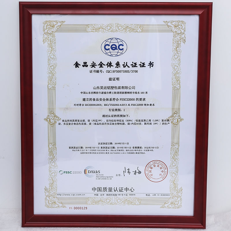 食品安全体系认证证书
